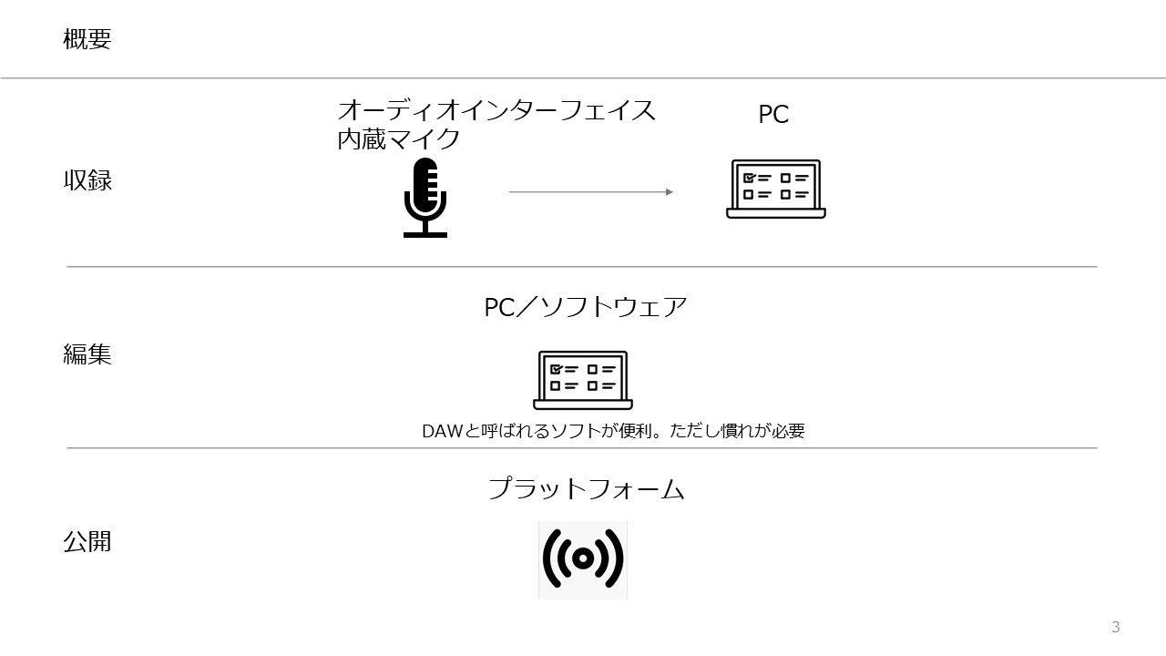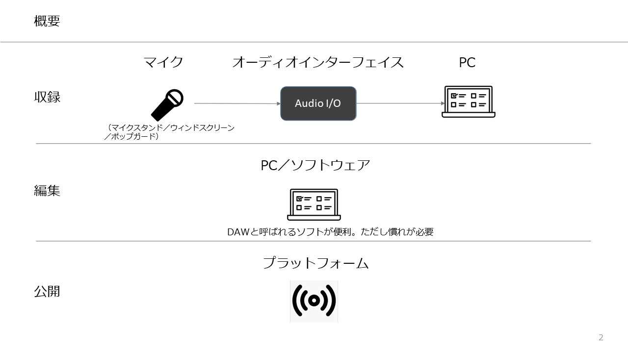 録音機材は音質を決定する要因です。音質がリスナーに与える印象は小さくないので、軽くみてはなりません。0円でもスタートすることはできますが、おすすめはしません。リスナーが聞き心地よく聞くことができる環境を整えるのは、発信者の責務と言えるでしょう。