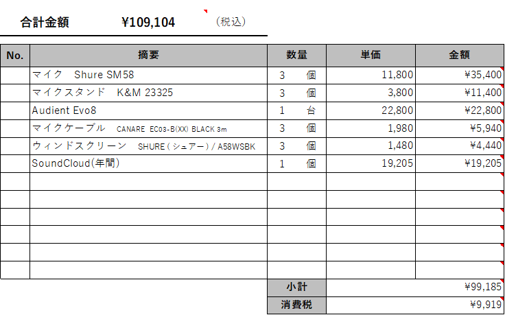 | ダイナミックマイク | Shure SM58 | 3 | ¥11,000 | ¥33,000 |