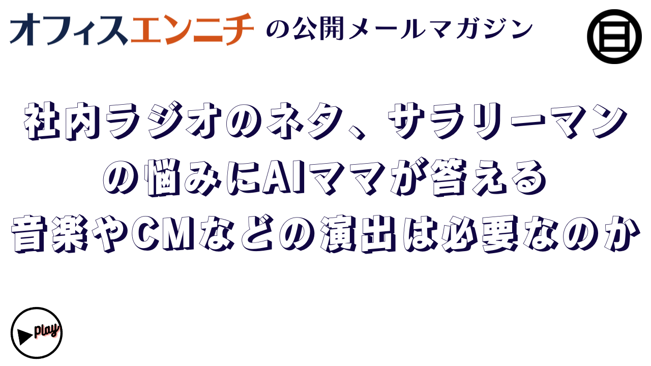 (おそらく)日本ナンバーワン社内ラジオ事業者である、オフィスエンニチがお送りするメールニュースです。お知らせが不要な方は、stakama@office-ennichi.comまでお知らせ下さい。クリックしてね!(音声が流れます)