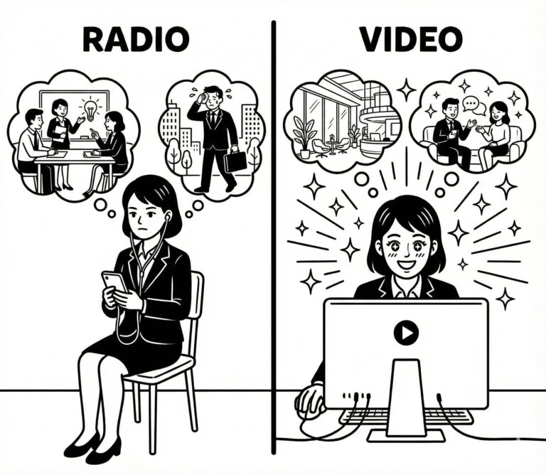 認知負荷が全く違います。音声のみで視覚を占有しないため、長尺でも聞いてもらいやすいのと、ながら作業ができるのは大きな特徴です。