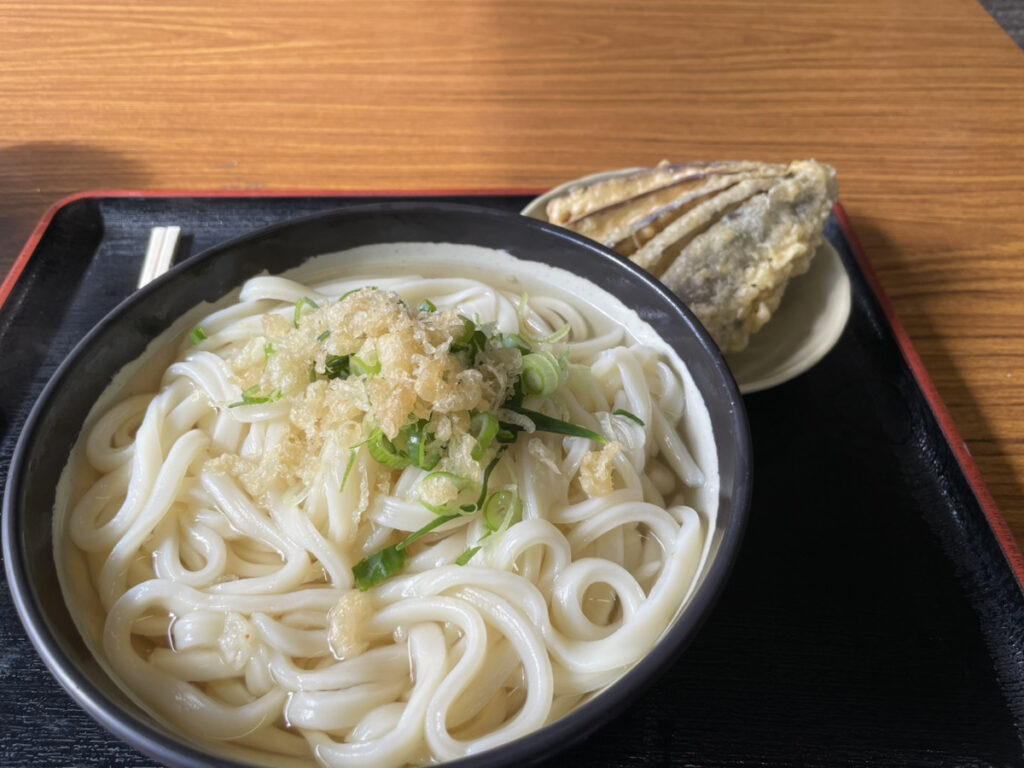 わたしも、何故か、他県から来たことを隠したくなって、「当たり前ですよね、湯通しくらい何度もやっています」という顔をして、いつもやっているかの如く、パッパッと勢いよく湯を切ってだし汁をかけるとなんとも愛おいセルフうどんの出来上がりです。